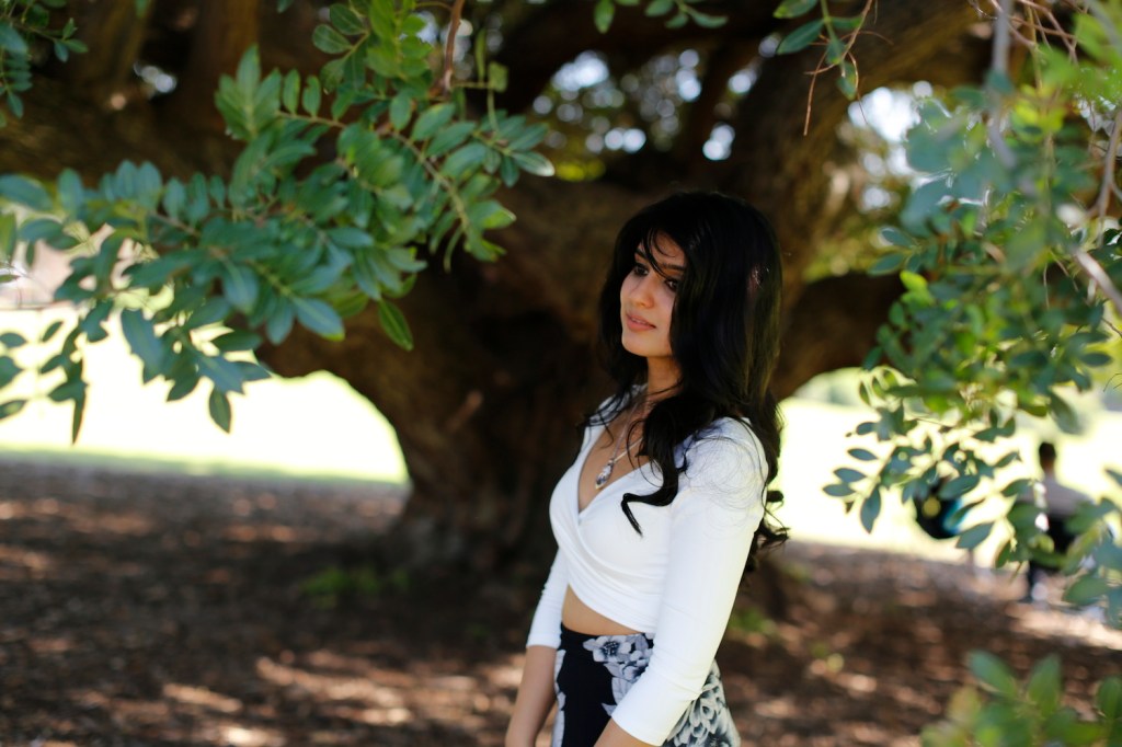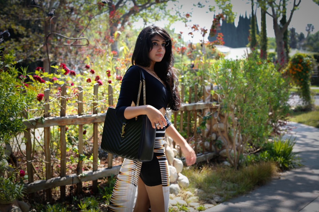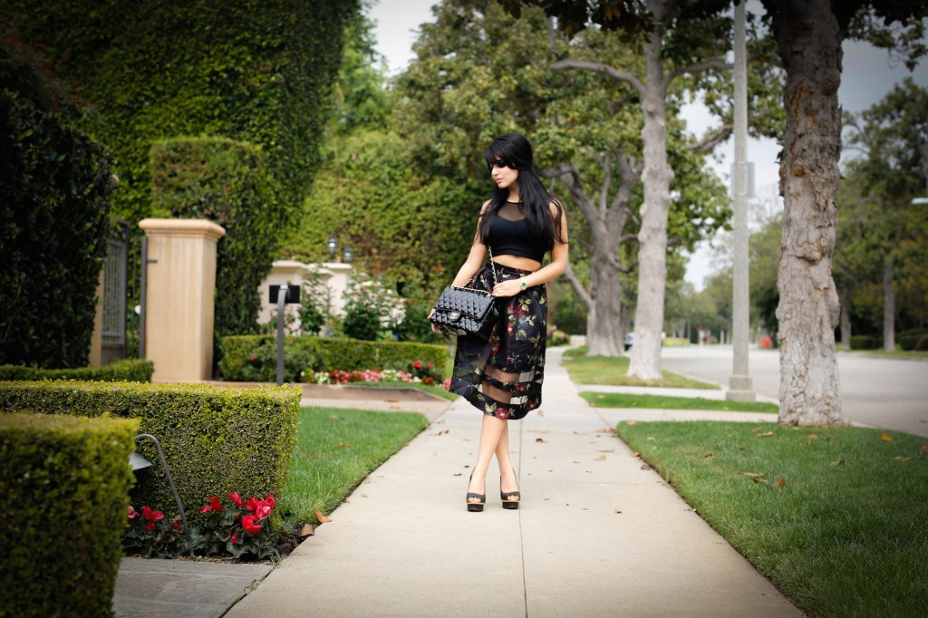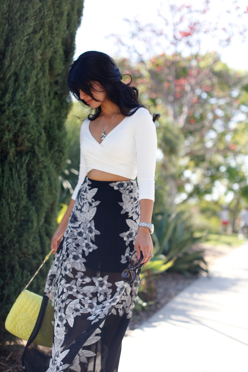 Today’s look is all about embracing California’s early Spring. A floral chiffon maxi skirt paired with a white crop top was the perfect attire for a stroll through the gardens. I chose to accessorize with a neon yellow-green Versace purse for a pop of color in my otherwise blanc et noir outfit.