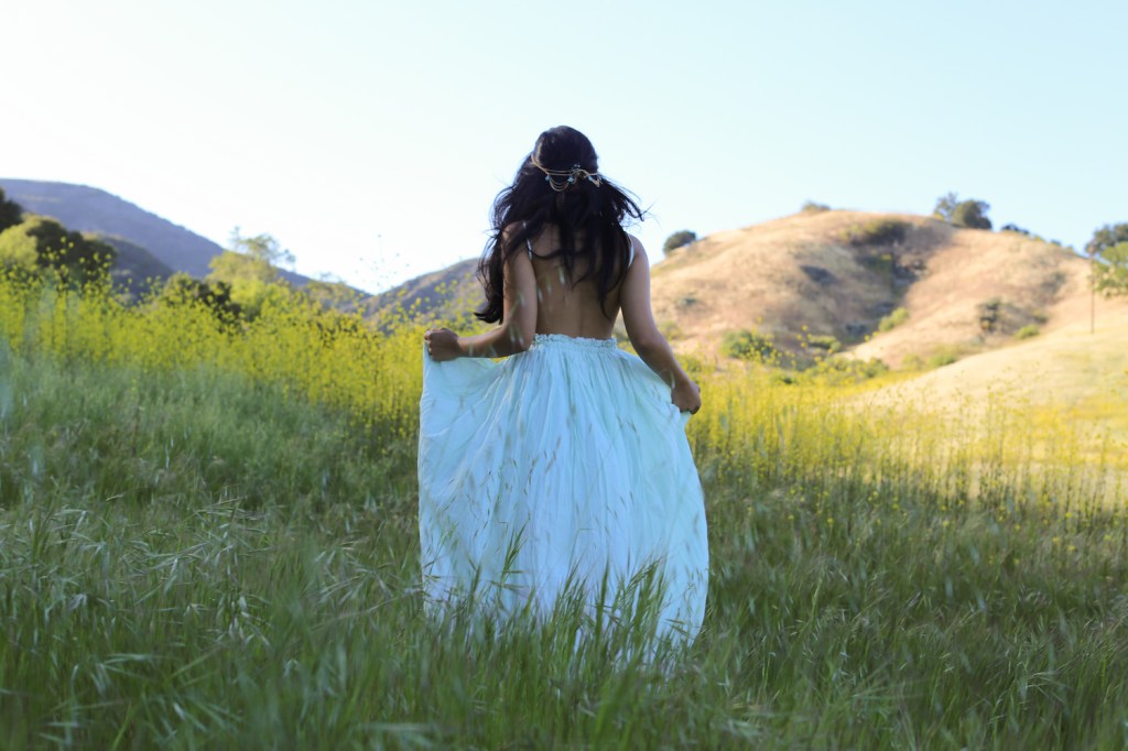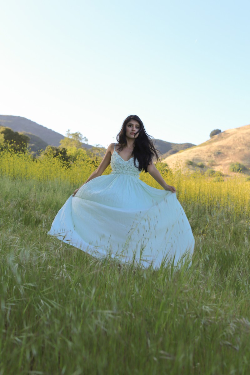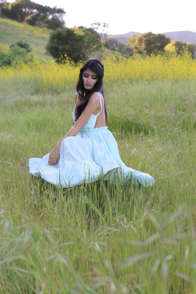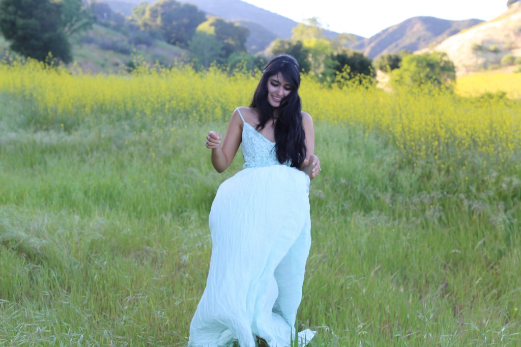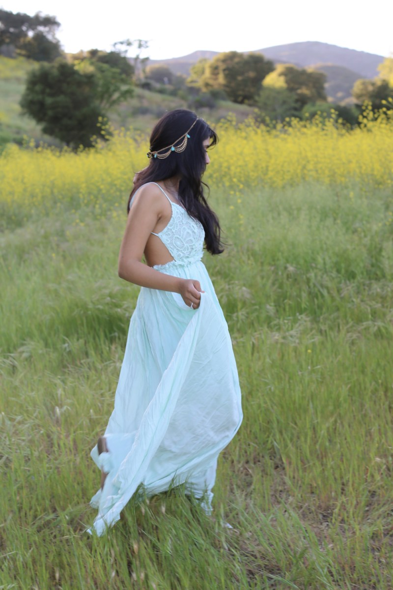 It’s festival season and I am channeling my inner bohemian princess in Malibu. I am wearing a mint cotton dress with my hair jeweled by a gold & turquoise headchain from India. The delicate crochet lace provides a romantic touch as I saunter about the fields into the sunset.