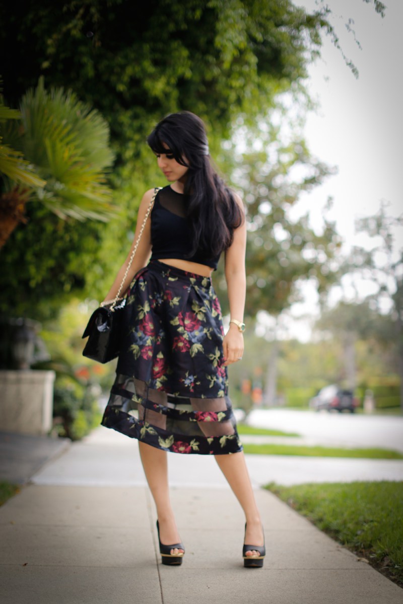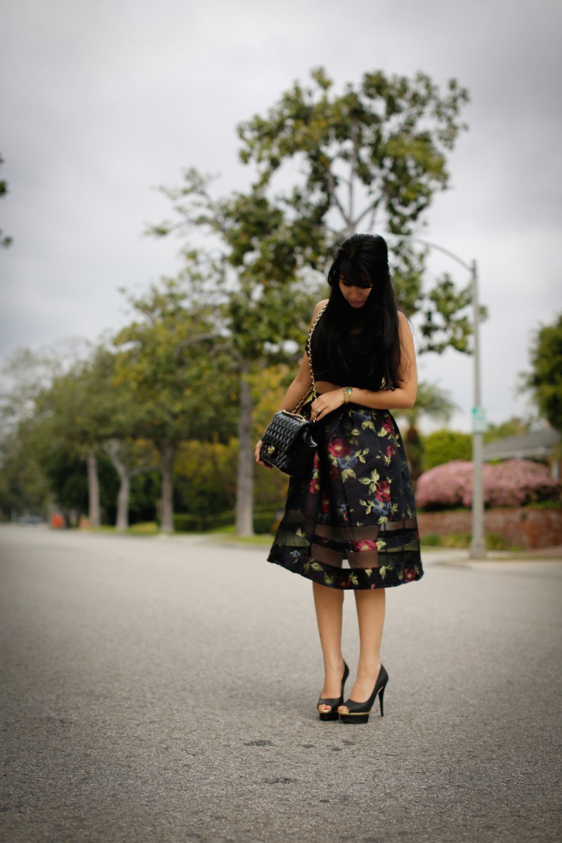 Craving to accessorize with black again, I chose to wear my classic Chanel bag while strolling through the neighborhood in my coordinating gold sole pumps. Spring has to be my favorite season, as it’s the time to wear nothing but skirts and dresses! I decided to wear a fun, floral midi skirt from Asos. With a structure synonymous with the full bloom of spring, the silk organza skirt provided the utmost feminine flair on such a beautiful day.